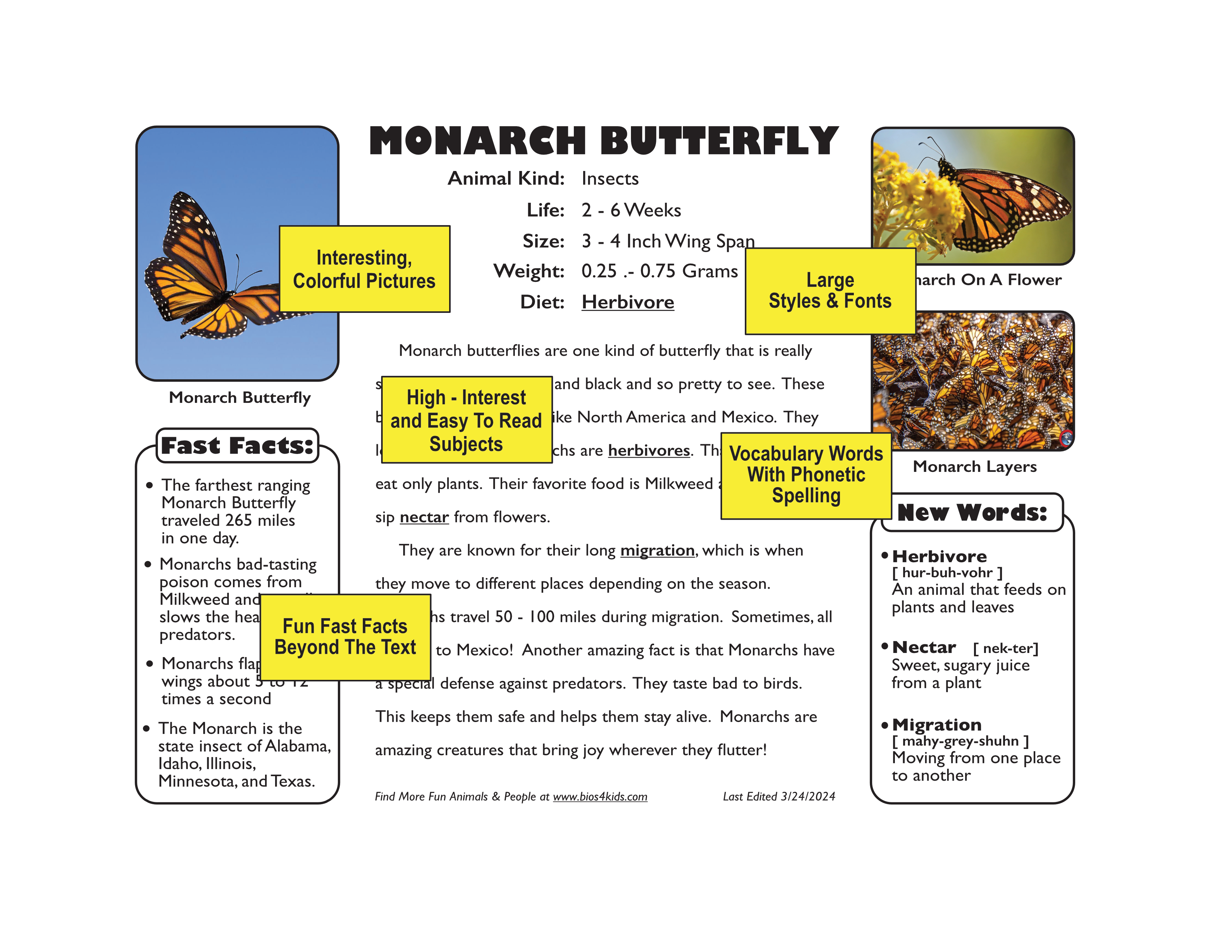 Bios4Kids provides easy-to-read, engaging materials on various topics. Our hi-lo information sheets bridge the gap between high-interest subjects and lower reading levels, making knowledge accessible to struggling readers, hesitant writers and English Language Learners. We strive to foster a love for learning by presenting information in a captivating yet comprehensible manner.